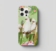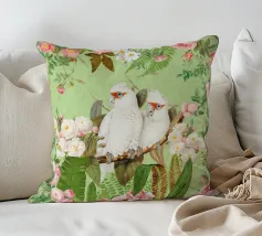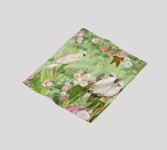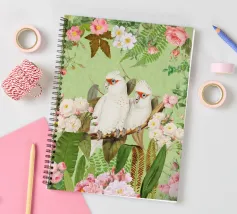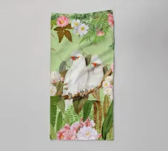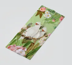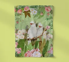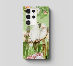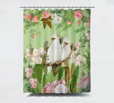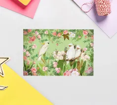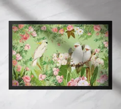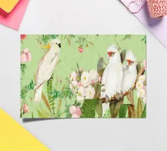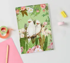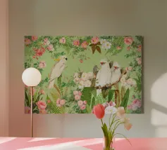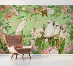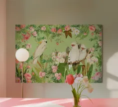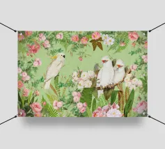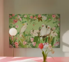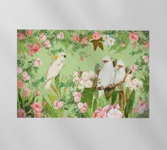 Un lussuoso disegno vintage di Uta Naumann con uno sfondo verde mela che fornisce una base fresca e vibrante per la scena. Al centro, due squisiti cacatua bianco-rosa si appollaiano con grazia, circondati da rigogliose rose Redouté dalle tenui sfumature rosa. La composizione cattura il fascino di antiche illustrazioni botaniche mescolate al fascino tropicale. Questo disegno in stile collage evoca eleganza e bellezza naturale, perfetto per un arredamento sofisticato, per la moda o per la cartoleria. La combinazione di verde vivo e fiori delicati crea un'estetica esotica e senza tempo.