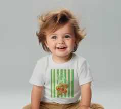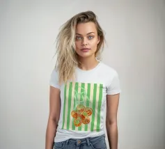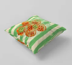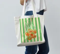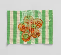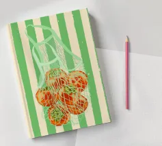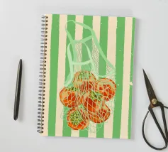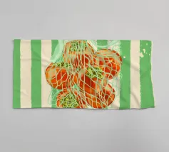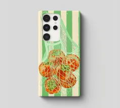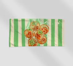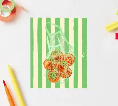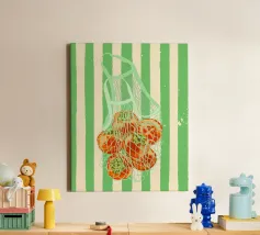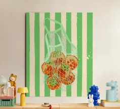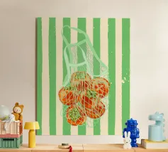 Una natura morta vivace e stravagante con succosi cachi annidati in un sacchetto di rete color menta, su strisce verdi di ispirazione vintage. Questo audace pezzo pop-art dà un tocco di freschezza alle pareti della cucina, agli angoli della galleria o al vostro angolino preferito. Un delizioso cenno alla vita lenta e al fascino retrò.