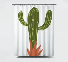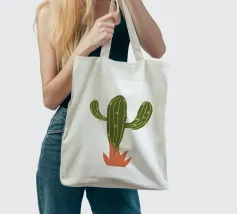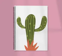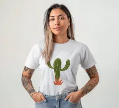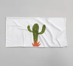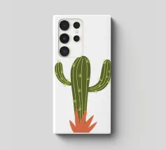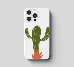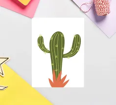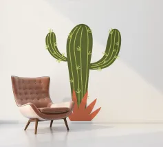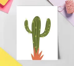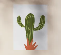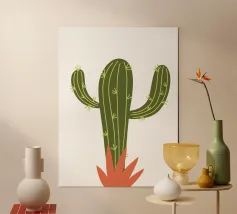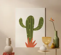 Un cactus stilizzato con tre braccia e dettagli a spillo si erge in alto. Alla base, una pianta arancione aggiunge un tocco di colore a contrasto.