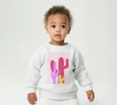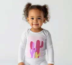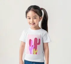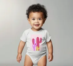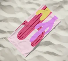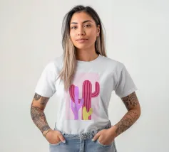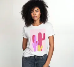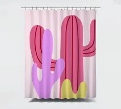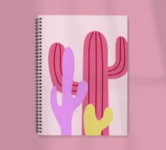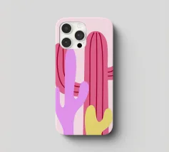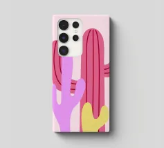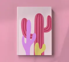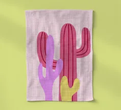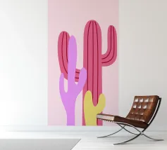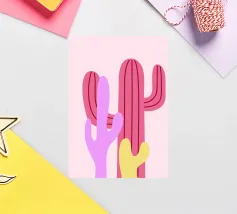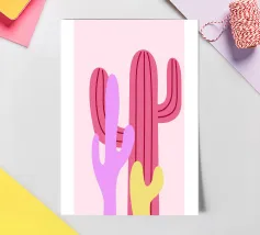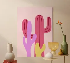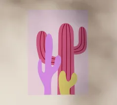 Illustrazione minimale di tre cactus nei toni vivaci del rosa, del viola e del giallo su uno sfondo rosa chiaro.