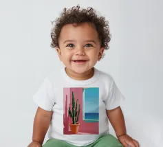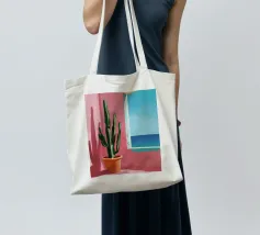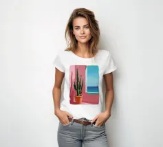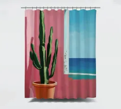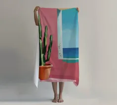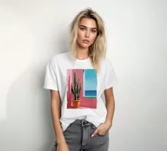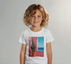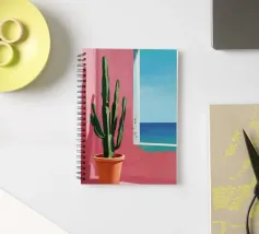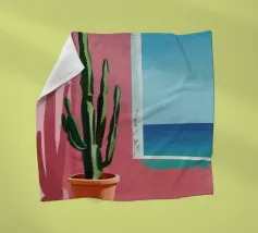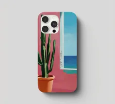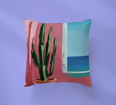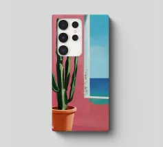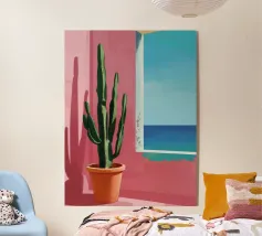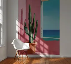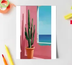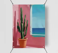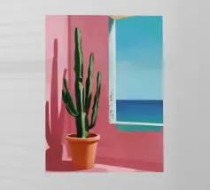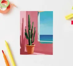 Una natura morta minimalista e serena di un singolo cactus alto in un vaso di terracotta, posto accanto a una finestra con vista su un mare blu e calmo. La composizione è pacifica, moderna e splendidamente semplice.
