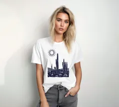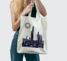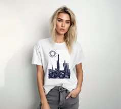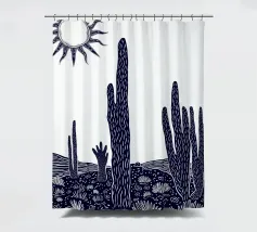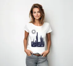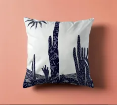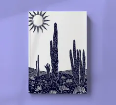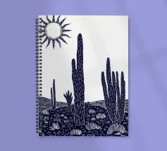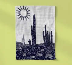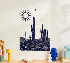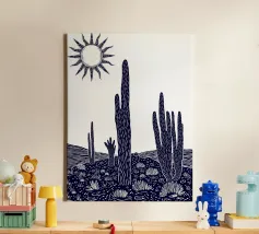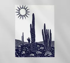 Una straordinaria illustrazione in stile linoleografico di un paesaggio desertico con cactus alti e strutturati sotto un sole radioso. Gli intricati disegni sulle piante e sul terreno creano un senso di profondità e di movimento, catturando la cruda bellezza dell'arida natura selvaggia.
