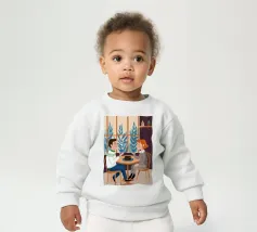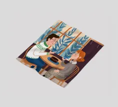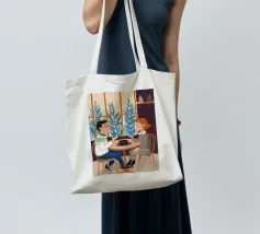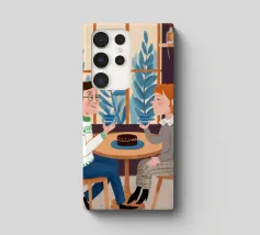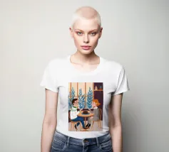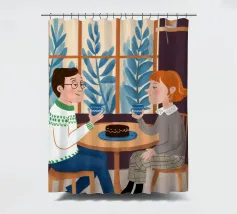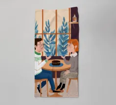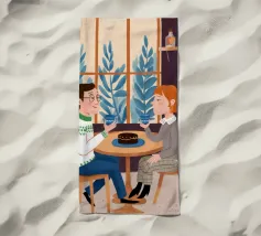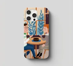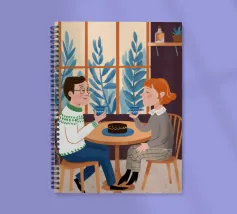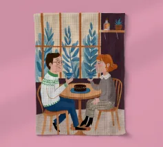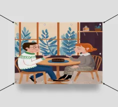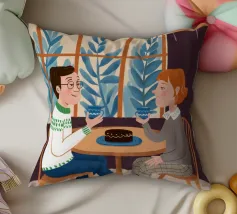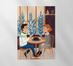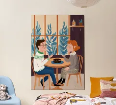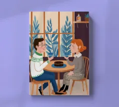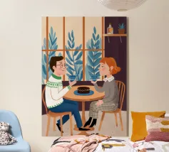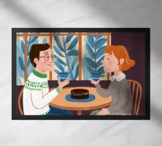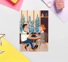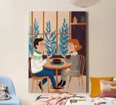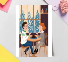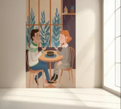 Illustrazione di una coppia che conversa davanti a un caffè in un incantevole bar pieno di piante. La scena è una rappresentazione calda, intima e dolce di un appuntamento moderno o di una chiacchierata amichevole.