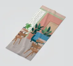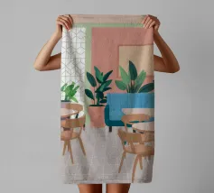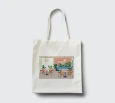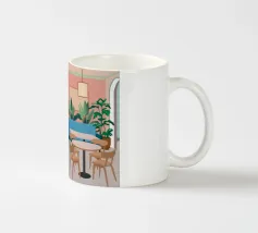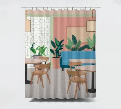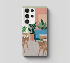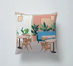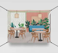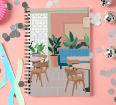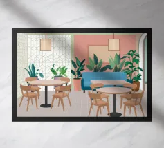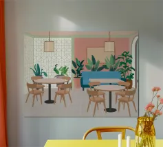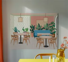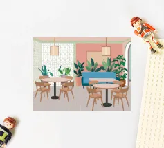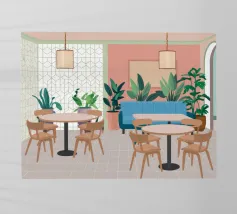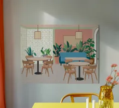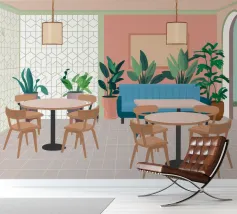 Un interno elegante di un caffè moderno con pareti rosa, un grande divano blu, piante verdi e semplici tavoli in legno. La scena è luminosa e invitante e cattura perfettamente un'oasi urbana chic e contemporanea.