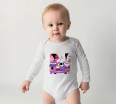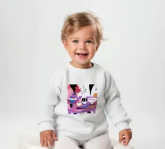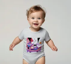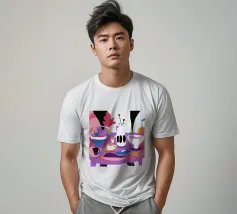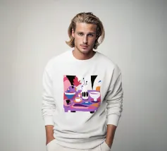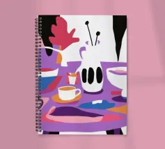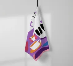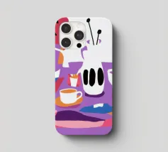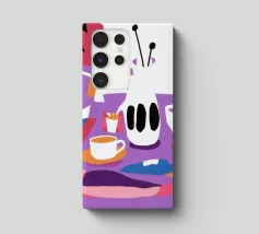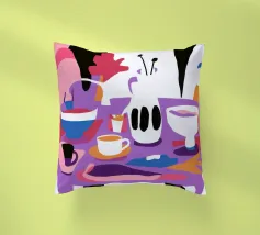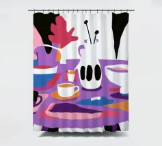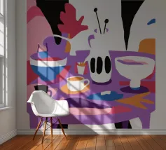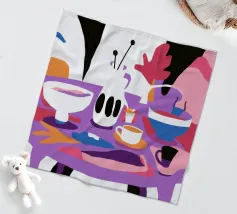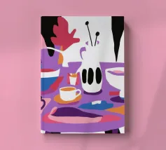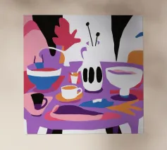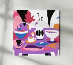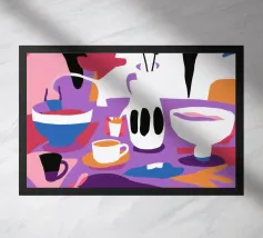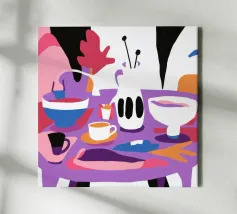 Una moderna natura morta di ispirazione cubista di un set da caffè o da tè su un tavolo viola. Le forme decostruite e l'audace tavolozza di colori creano un'interpretazione dinamica e artistica di un rituale quotidiano.
