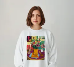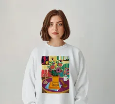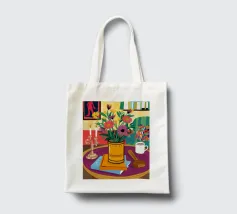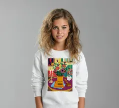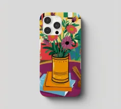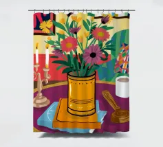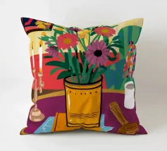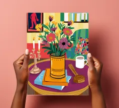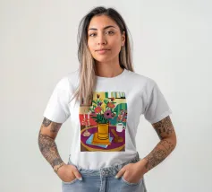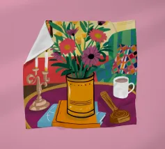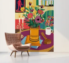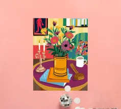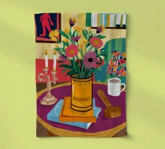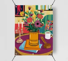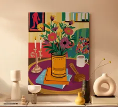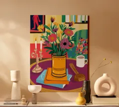 Una vivace natura morta con una tazza di caffè e un bel mazzo di fiori su un tavolo rotondo a fantasia. I colori ricchi e la composizione vivace creano una scena mattutina o pomeridiana allegra ed energica.