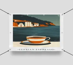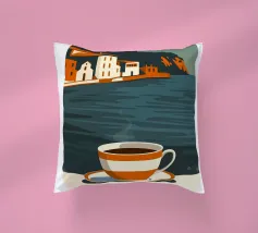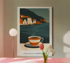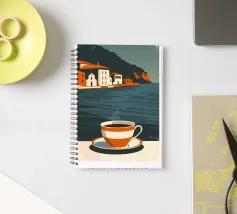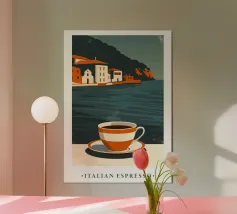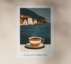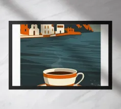 caffè espresso tazza piattino vapore costa acqua case edifici scogliera mare oceano riva piatto città costiera orizzonte all'aperto bevanda calda cultura italiana vista panoramica