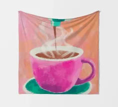 Una vivace pittura acrilica in rosa, turchese e arancione raffigura eleganti tazze da caffè che celebrano la passione per il caffè e l'arte del barista. Questa illustrazione minimalista porta colore e creatività in ogni cucina.