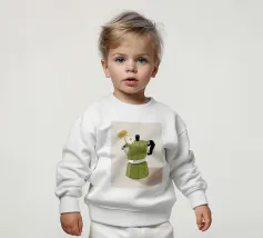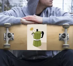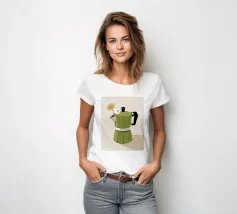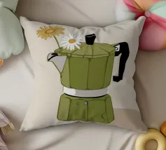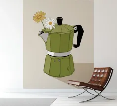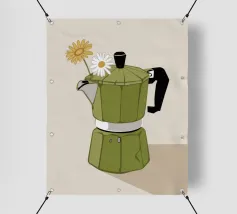 La classica caffettiera Moka è elegantemente presentata come un vaso che contiene una singola e delicata margherita bianca, unendo i rituali del caffè e la bellezza della natura in una natura morta minimalista.