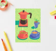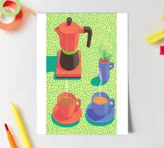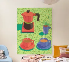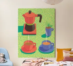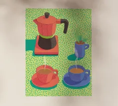 Infondete gioia nel vostro spazio con questo poster pop art che raffigura una caffettiera e tazze fumanti in colori vivaci e puntinisti. Un vivace tributo alla cultura del caffè, che fonde toni pastello e stile grafico, perfetto per la cucina, l'ufficio o l'angolo lettura. Ideale per un regalo o per l'ispirazione quotidiana, fa parte della collezione JUNIQE di opere d'arte da parete personalizzabili, stampe e decorazioni creative per la casa. Lasciate che ogni sguardo sia come il primo sorso.