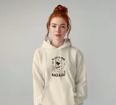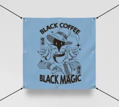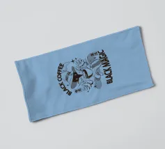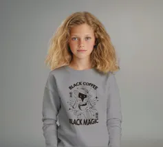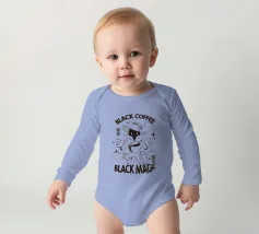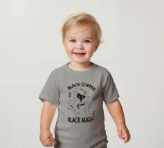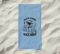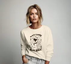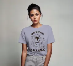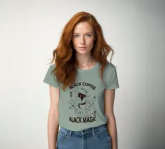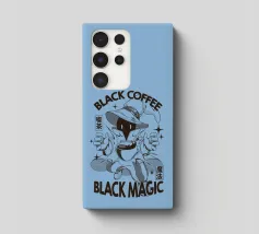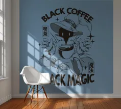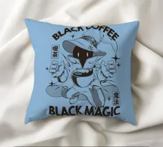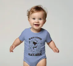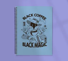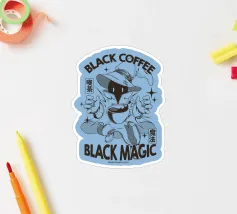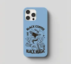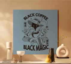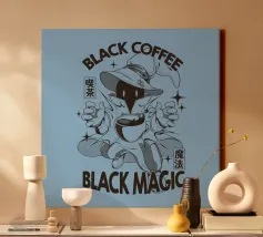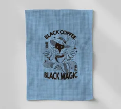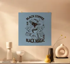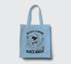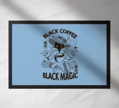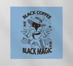 Un'illustrazione in toni marroni su sfondo azzurro che raffigura un mago che esegue una magia per evocare una tazza di caffè e intorno alla quale è scritto "Black Coffee Black Magic". Si tratta di un disegno umoristico che gioca con le parole magia nera e caffè nero, presentando il caffè come un oggetto magico. È il regalo ideale per gli amanti del caffè che amano un tocco di umorismo nel loro caffè nero.
