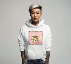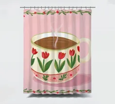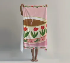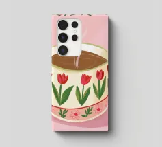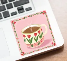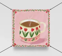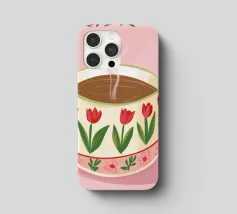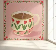 Un'incantevole illustrazione di una tazza di caffè rosa con bellissimi tulipani, circondata da una delicata corona floreale, celebra la semplice bellezza e l'amore di una buona tazza di caffè.