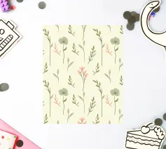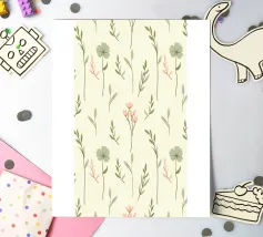 Un motivo floreale morbido e minimale con delicati fiori di campo e foglie verde salvia su uno sfondo tenue. Perfetto per un'estetica ispirata alla natura con un'atmosfera accogliente e rustica. Un'eleganza senza sforzo, che conferisce calma e terrosità a qualsiasi spazio.