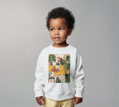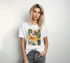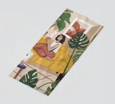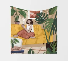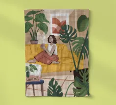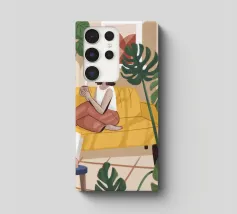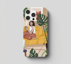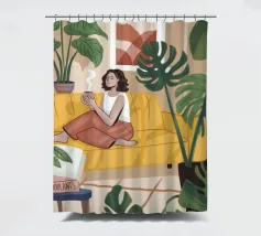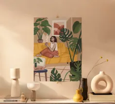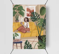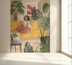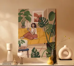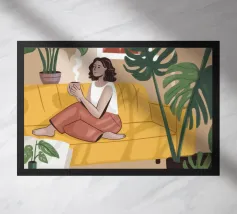 Questo dipinto ritrae una persona seduta su un divano giallo, che si gode una tazza di caffè o di tè. La stanza è immersa nella luce del sole, con grandi piante verdi che aggiungono un tocco rinfrescante. La scena emana calma e appagamento, ideale per una mattinata tranquilla.