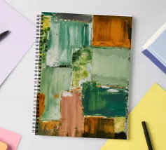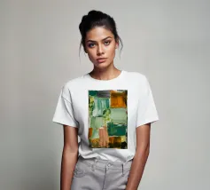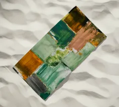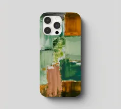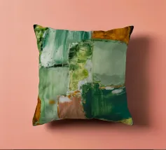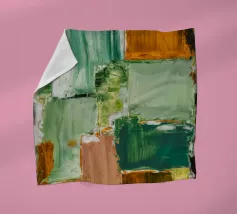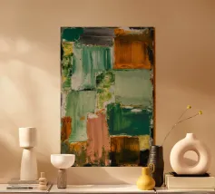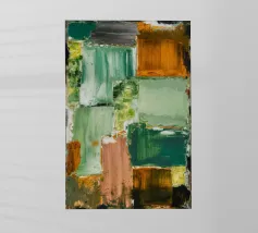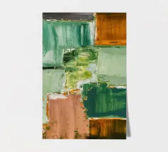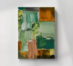 Un'opera d'arte astratta con una disposizione rilassante di macchie quadrate e rettangolari in varie tonalità di verde, marrone e beige, che ricordano un campo sereno e patchwork o una superficie tranquilla e strutturata. Stile Bob Nugent.