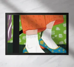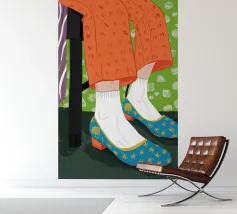 Un'illustrazione ravvicinata si concentra sui piedi di una persona che indossa pantaloni arancioni e calzini a pois colorati ed eccentrici con scarpe dalla punta blu, celebrando uno stile personale e giocoso.