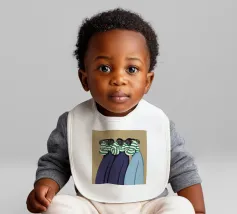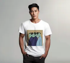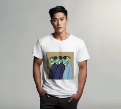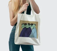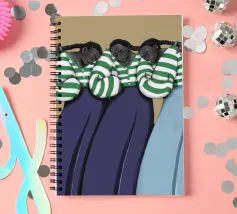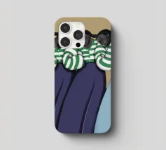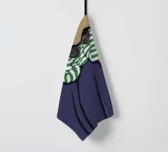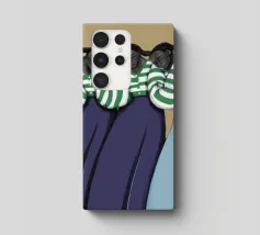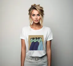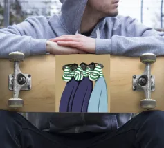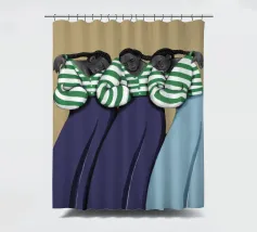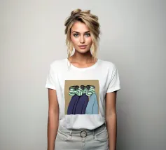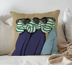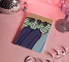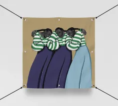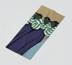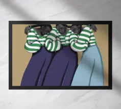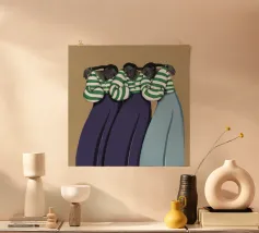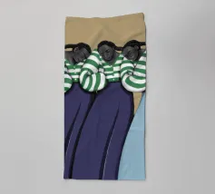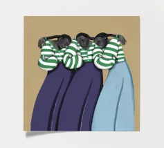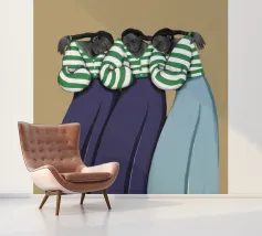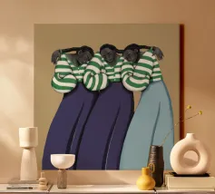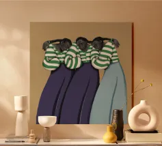Un'illustrazione eccentrica e minimalista mostra un primo piano di tre paia di gambe affiancate, che indossano calzini a righe verdi e bianche abbinati.