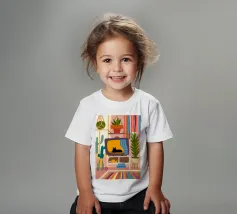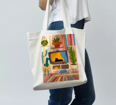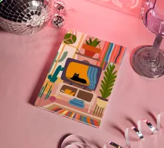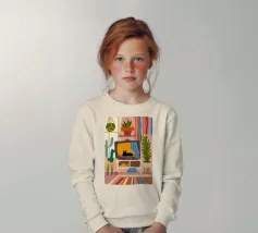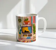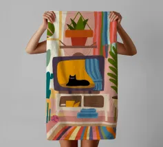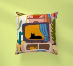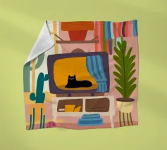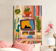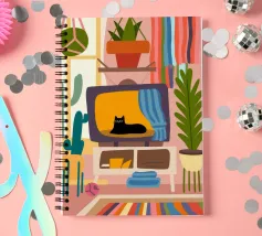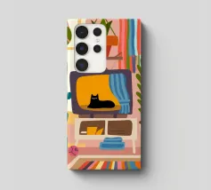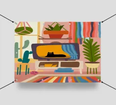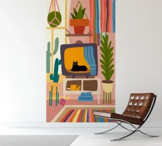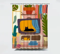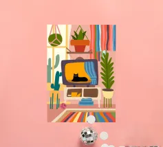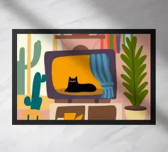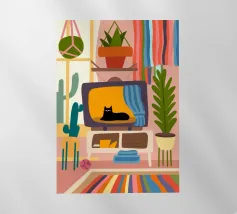Questa immagine raffigura una stanza accogliente con un gatto nero sdraiato su un televisore. La stanza è piena di piante, una libreria e decorazioni colorate che creano un'atmosfera calda e invitante.