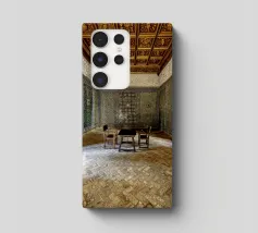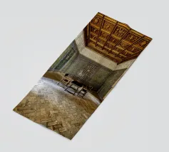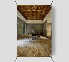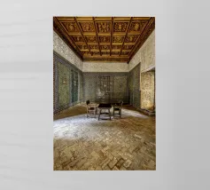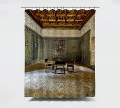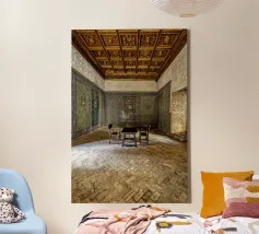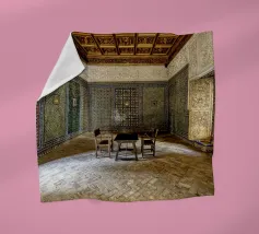L'immagine mostra un interno storico della Casa de Pilatos di Siviglia, un palazzo del XVI secolo con influenze architettoniche mudéjar, gotiche e rinascimentali. Le pareti sono completamente ricoperte da piastrelle decorate con motivi geometrici e floreali nei toni del blu, del verde e del marrone. Queste piastrelle sono tipiche dell'arte mudéjar e riflettono la diversità culturale dell'Andalusia. Il soffitto è costituito da pannelli in legno dorato con complessi ornamenti e rilievi che documentano la maestria dell'epoca.