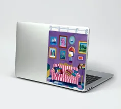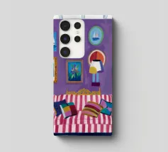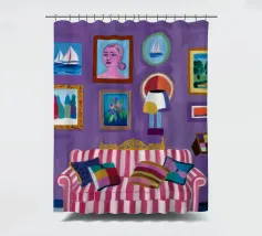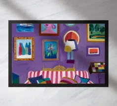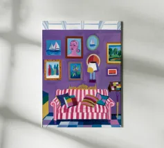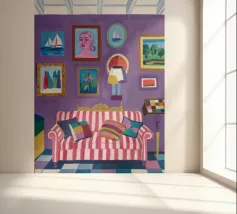 Un soggiorno vivace con un'audace parete viola, un divano a strisce rosa e una galleria d'arte colorata. L'eclettico mix di colori e arredi crea uno spazio divertente, energico e senza fronzoli.