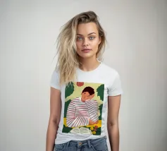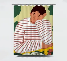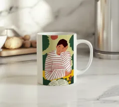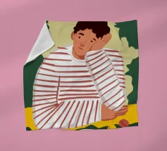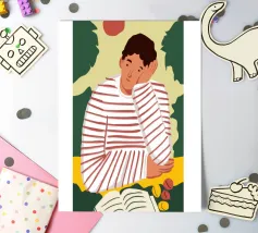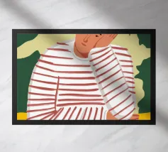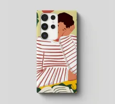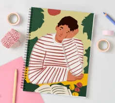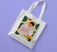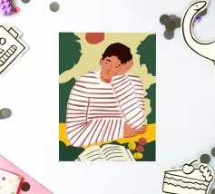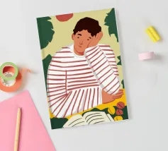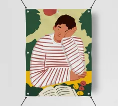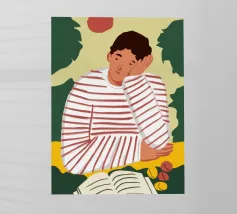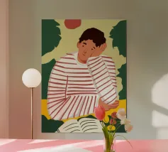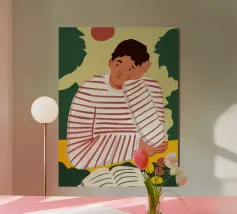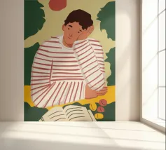 Illustrazione di una persona con una classica camicia a righe, immersa in un libro e circondata da rigogliose piante verdi. La scena è una rappresentazione pacifica, accogliente e intellettuale di un perfetto rifugio per la lettura.