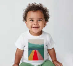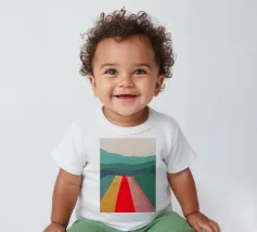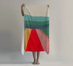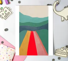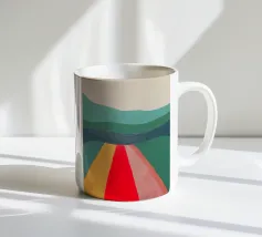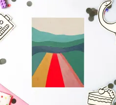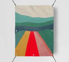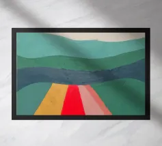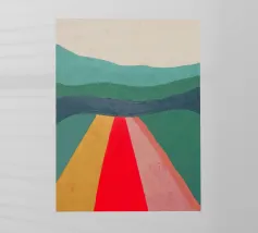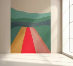Un moderno motivo paesaggistico in chiare aree cromatiche: i toni forti del rosso, del rosa tenue e del giallo caldo incontrano colline verdi e un orizzonte blu intenso. Questo disegno gioca con l'equilibrio, la profondità e l'astrazione e ricorda la tranquillità dei campi aperti nella luce estiva. Una dichiarazione espressiva per ambienti moderni - minimalista, calma e piena di tensione artistica.