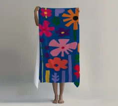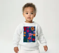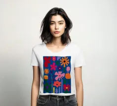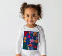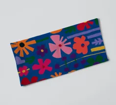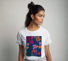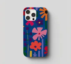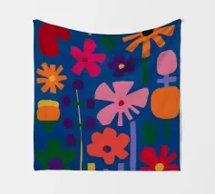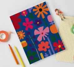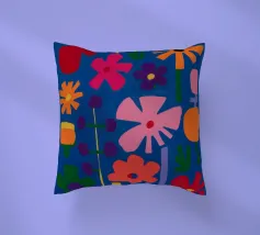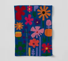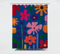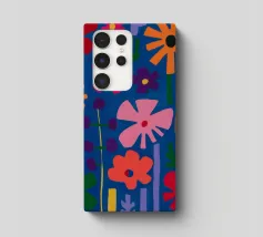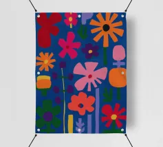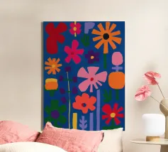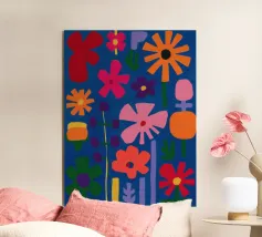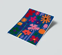 Un affascinante motivo di fiori semplici e stilizzati in una tavolozza di colori retrò, arancione, blu e rosa, su steli dritti, che creano un campo nostalgico e allegro.