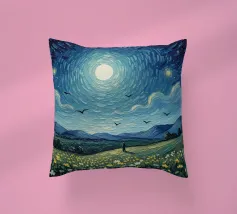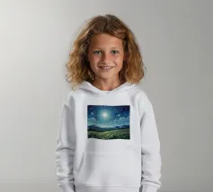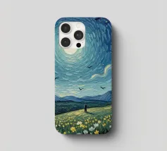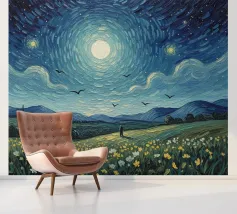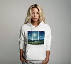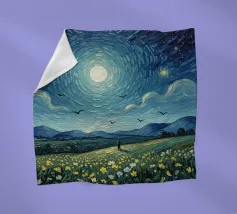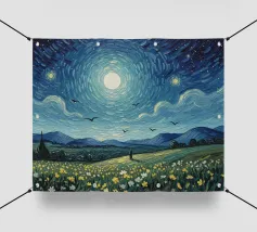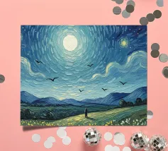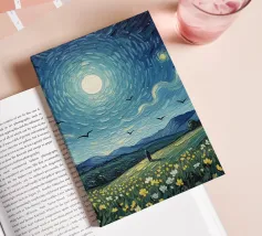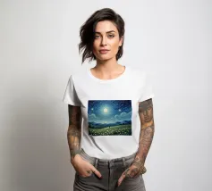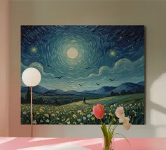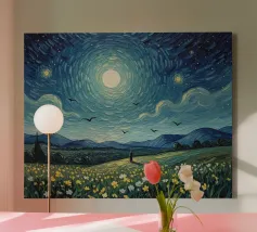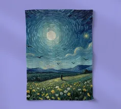 Immerso nella luce argentea, il paesaggio sembra tranquillo e surreale: un luogo dove il tempo rallenta e il mondo respira dolcemente. La luna aleggia come un guardiano vigile, illuminando erbe, ombre e immaginazione. Quest'opera invita alla riflessione, alla meraviglia e a un senso di pacifica solitudine nella vastità della notte.