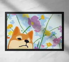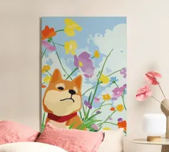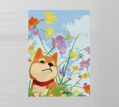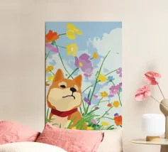 cane fiori nuvole cielo blu erba collare rosso campo giornata di sole primavera all'aperto natura fiori gialli fiori viola fiori arancioni steli verdi modello floreale animale domestico animale paesaggio colori vivaci