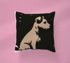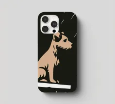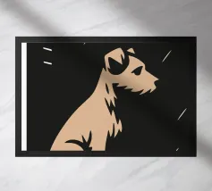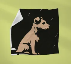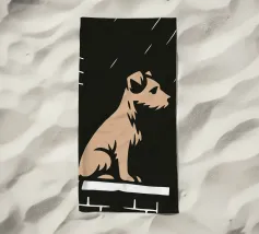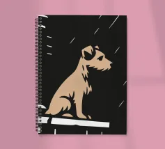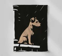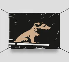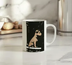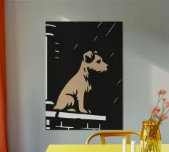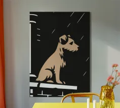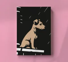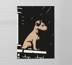 Motivo di un cane stilizzato su un tetto sotto la pioggia. Un fumetto espressivo per i fan dei cani, gli amanti degli animali e gli appassionati di illustrazioni minimaliste ed emozionali con un tocco urbano.