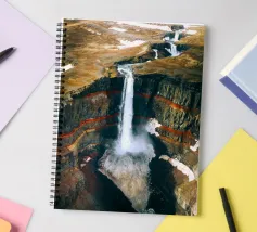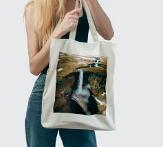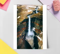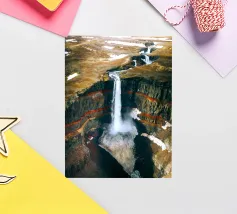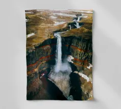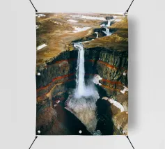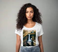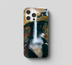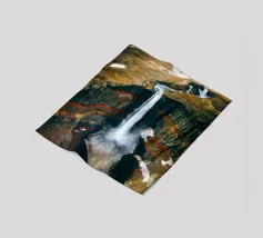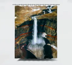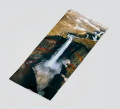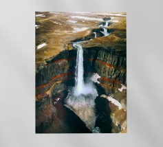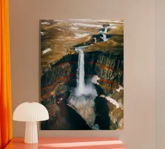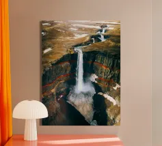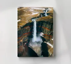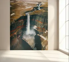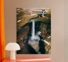 L'acqua si infrange nella piscina sottostante, diffondendo la nebbia nell'aria e riecheggiando nella profonda e stretta gola. Scolpite nel corso dei secoli, le ripide scogliere del canyon si ergono drammaticamente su entrambi i lati, stratificate nelle tonalità terrose del rosso, dell'arancione e del marrone. Piccole piante si aggrappano alle sporgenze rocciose, sfidando le dure condizioni. Dall'alto, la cascata appare come un nastro scintillante che taglia il cuore della pietra: un'esibizione mozzafiato della forza e della bellezza della natura.
