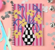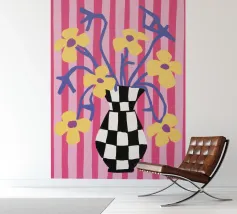 Una vibrante ed energica natura morta con un audace vaso a scacchi bianchi e neri traboccante di un caotico bouquet di fiori colorati. Lo sfondo a strisce rosa e gialle esalta l'energia massimalista e gioiosa.