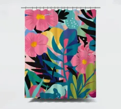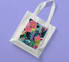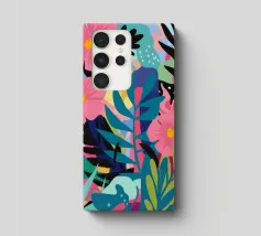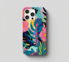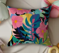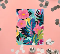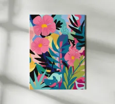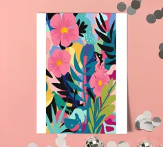 Un'esplosione vibrante e caotica di fiori astratti in rosa, blu, arancione e verde, che creano una composizione floreale gioiosa ed energica.