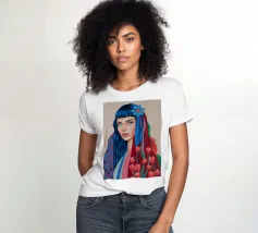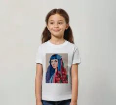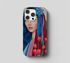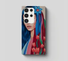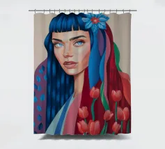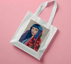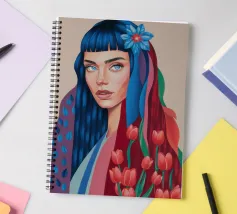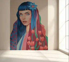 Uno splendido ritratto di donna i cui capelli sono una vibrante cascata di ciocche colorate, mescolate a tulipani rossi e bianchi. L'opera d'arte è una splendida e surreale fusione di bellezza umana e natura floreale.