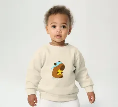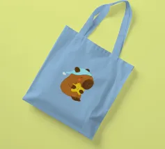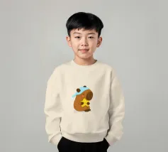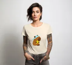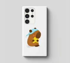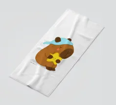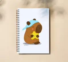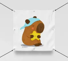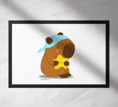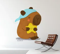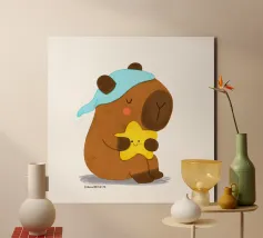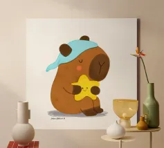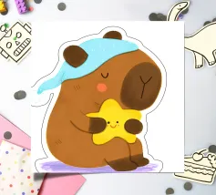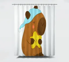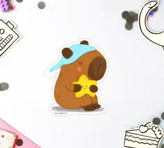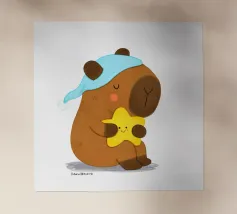 Simpatico disegno di capibara che indossa un cappello per dormire e abbraccia un cuscino a forma di stella. Sogni d'oro, piccolo capibara.