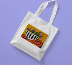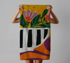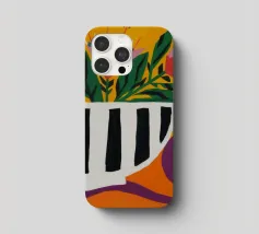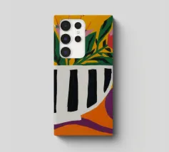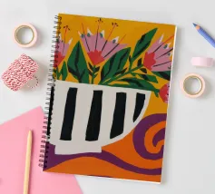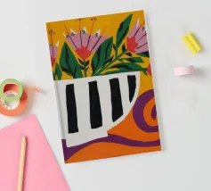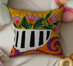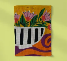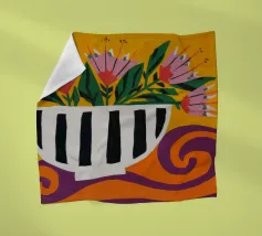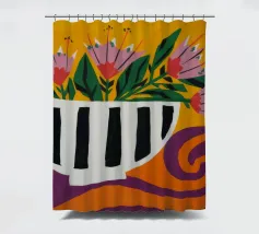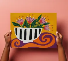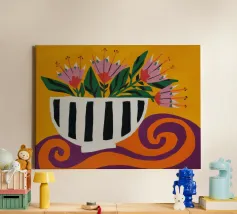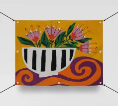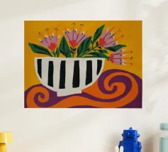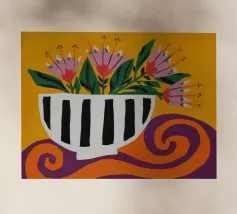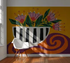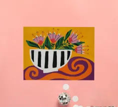 Una composizione chic di delicati fiori rosa disposti in un'audace ciotola a righe bianche e nere. La composizione è collocata su uno sfondo giallo arancio caldo con giocose volute viola.