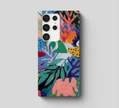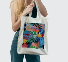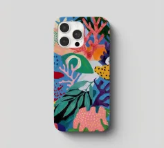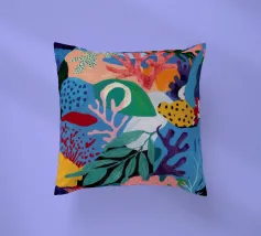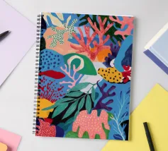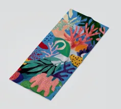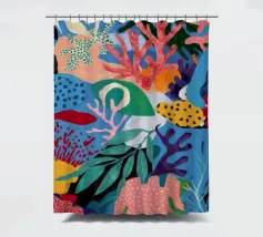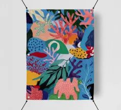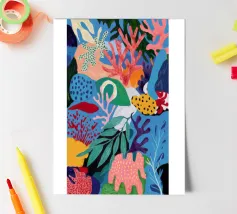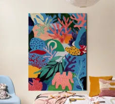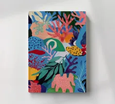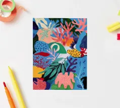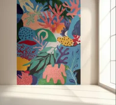 Una vibrante e vivace rappresentazione di una barriera corallina sottomarina, ricca di coralli stilizzati, alghe e creature fantasiose in un carnevale di rosa, arancioni, blu, verde acqua e giallo.