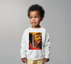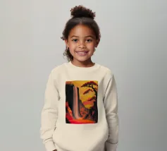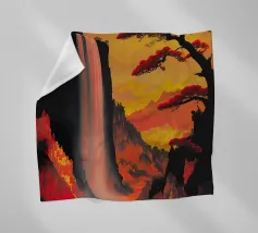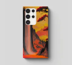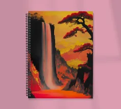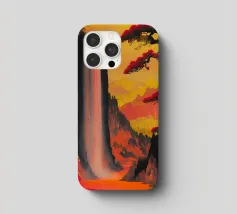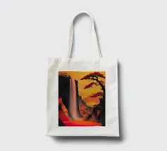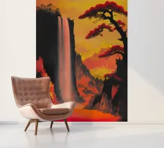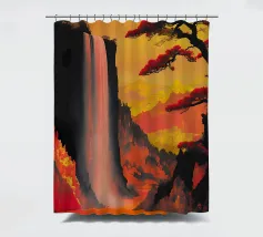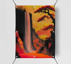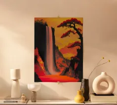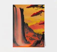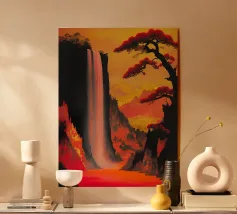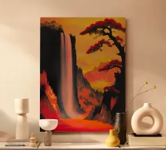 Un dipinto paesaggistico mozzafiato che raffigura una cascata in mezzo a un tramonto vibrante e infuocato. Un pino solitario si staglia sullo sfondo drammatico, con i suoi rami che si stagliano contro il cielo infuocato. La scena è ricca di colori contrastanti che creano un senso di stupore e meraviglia.