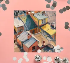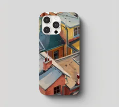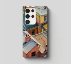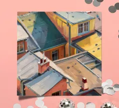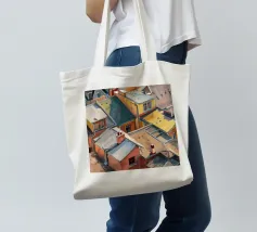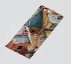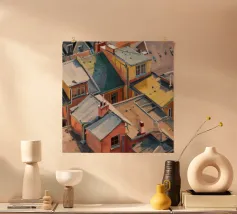 Un'energica veduta dall'alto cattura una cascata di tetti colorati, gialli, rossi e blu, che si contendono lo spazio. Il dipinto è una celebrazione vibrante, quasi astratta, della trama densa e vivace di una vecchia città.