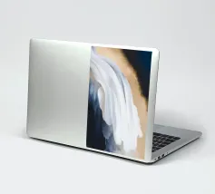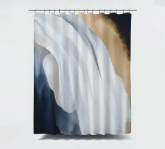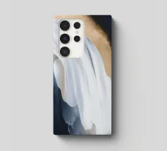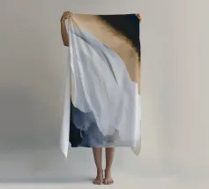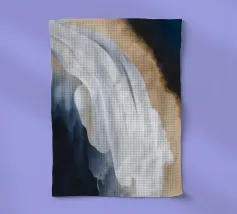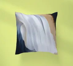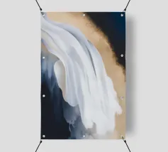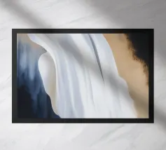 Un'opera astratta di grande impatto, caratterizzata da un flusso fluido e a cascata di bianco e blu tenue, contrastato da una fascia d'oro ricca e strutturata sul lato. La composizione emana un senso di tranquilla grandezza e di fluida eleganza.
