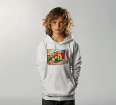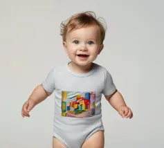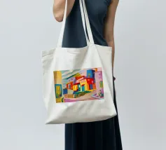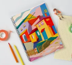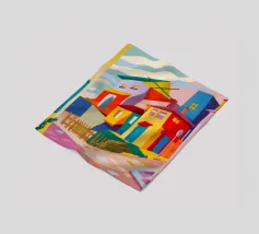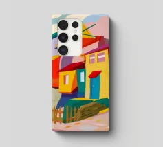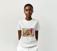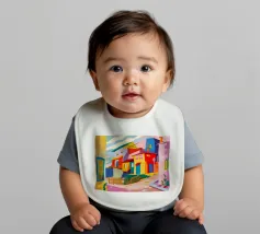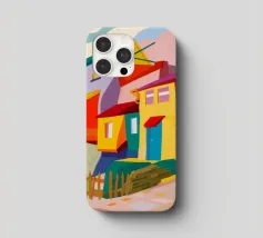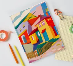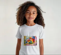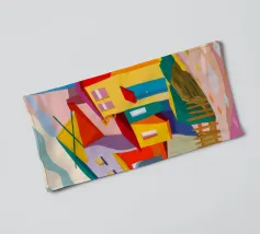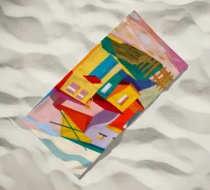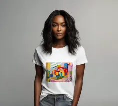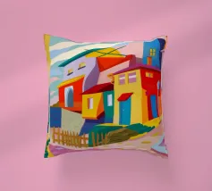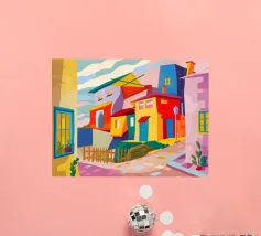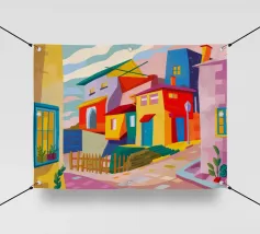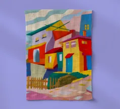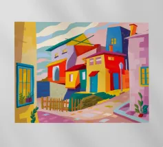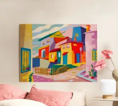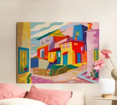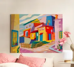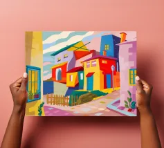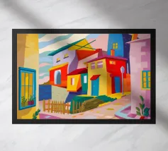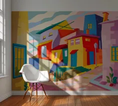 Una vibrante rappresentazione astratta di case colorate sul pendio di una collina, che utilizza forme geometriche e una tavolozza audace, che ricorda l'arte cubista, trasmettendo una comunità dinamica e vivace.