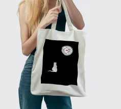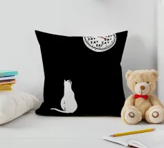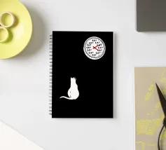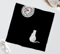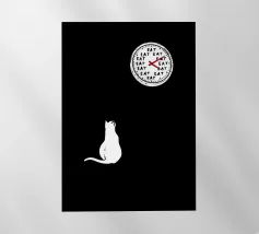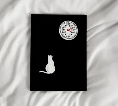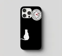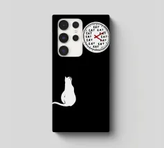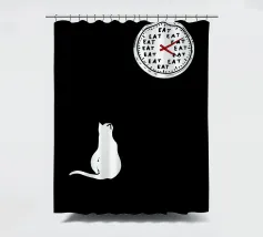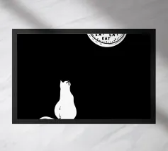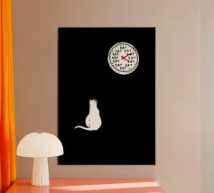Un gatto guarda un orologio che mostra con umorismo la parola "EAT" al posto dei numeri. Il design minimalista sottolinea la singolare attenzione del felino per il momento del pasto.