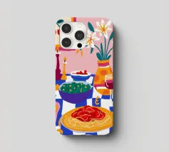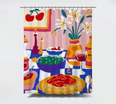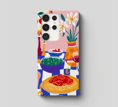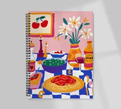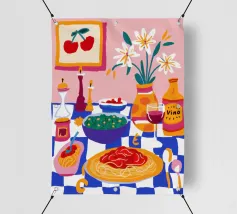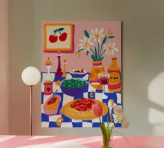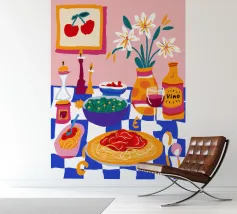 Una deliziosa natura morta di un piatto di spaghetti con ciliegie, una bottiglia di vino e un vaso di fiori. La composizione è una rappresentazione ricca, appetitosa e affascinante di un pasto perfetto e semplice.
