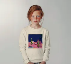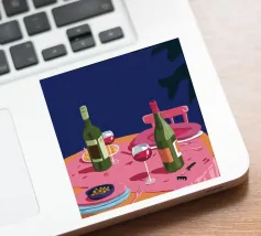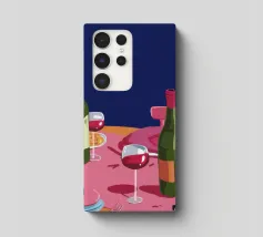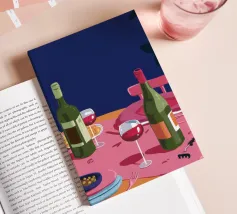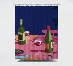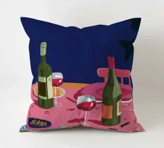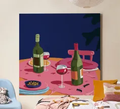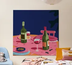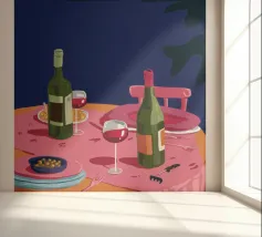 Una natura morta intima di una cena per due con una bottiglia di vino, bicchieri e olive su una tovaglia rosa, su uno sfondo scuro che ricorda un vigneto al tramonto.