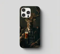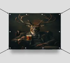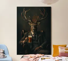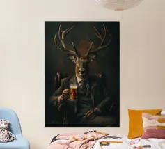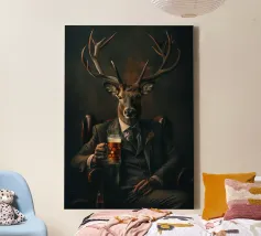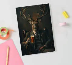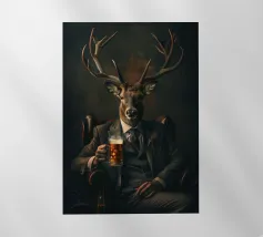 cervo corna abito cravatta birra raffinato sofisticato sedia legno bevanda animale simile all'uomo vetro scuro formale eleganza ritratto ibrido giacca poltrona