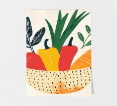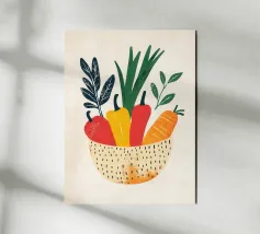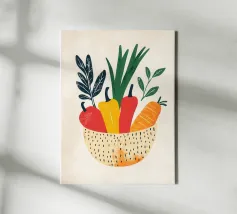 Date alla vostra casa un'atmosfera naturale e ricca di vitamine con questa vivace illustrazione. Verdure colorate in un cesto strutturato creano un'atmosfera calda e rilassante. Perfetto per una cucina o uno spazio abitativo di grande ispirazione.