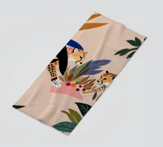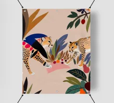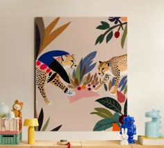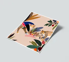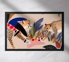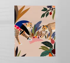 Immergetevi nel mondo vibrante della savana africana con questa deliziosa opera d'arte che mostra due ghepardi che si godono un picnic giocoso nella giungla lussureggiante. In questa scena stravagante, i due maestosi felini hanno allestito un accogliente ritrovo, con frutta fresca intorno. I ghepardi camminano l'uno verso l'altro, con i loro manti maculati che brillano alla luce del sole che filtra attraverso le chiome verdeggianti.