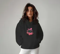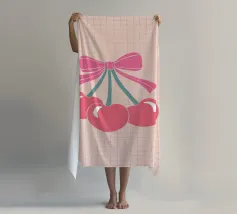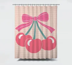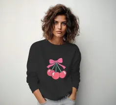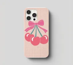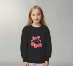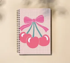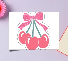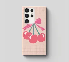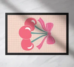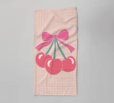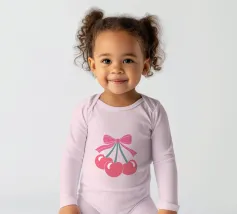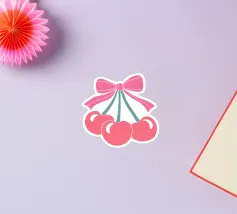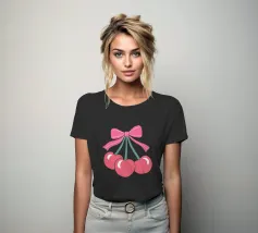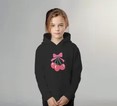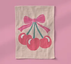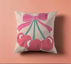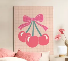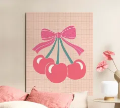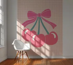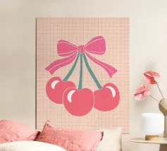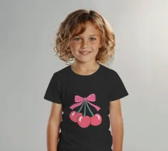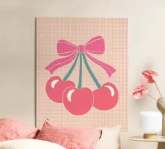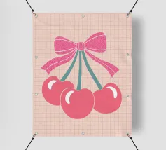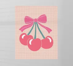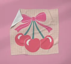 Illustrazione di ispirazione vintage con tre ciliegie legate da un delicato fiocco rosa. Perfetta per decorare accessori, tessuti e prodotti per bambini, aggiungendo un tocco dolce e romantico.