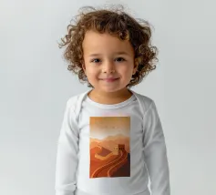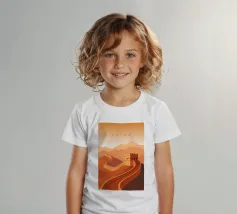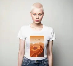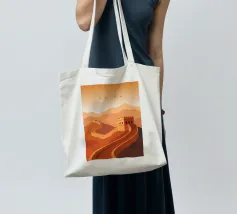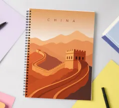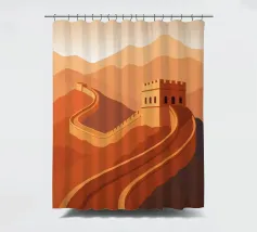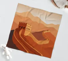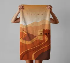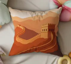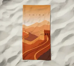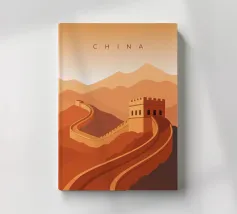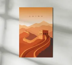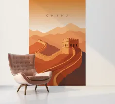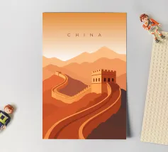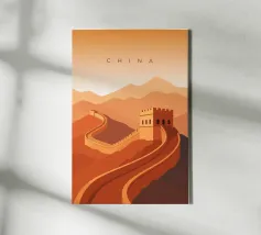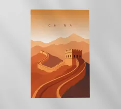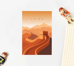 Design di viaggio minimalista della Cina con la famosa Grande Muraglia cinese in stile stilizzato e le montagne e le colline che caratterizzano il paesaggio della regione. Punto di riferimento cinese e paesaggio montano in stile minimalista.