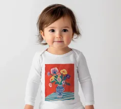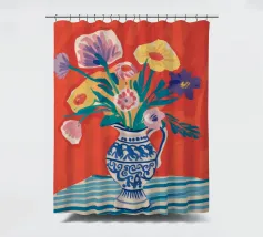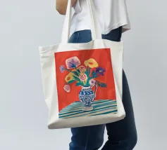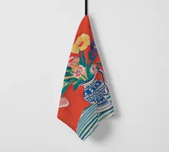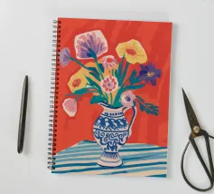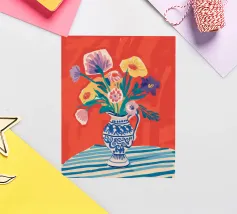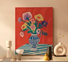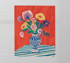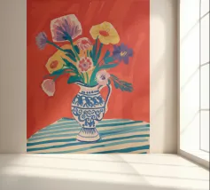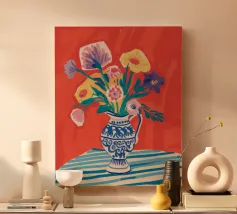 Un vivace bouquet di fiori nei toni del rosso, del giallo e del blu è disposto in un classico vaso a cineserie blu e bianco. L'ambientazione comprende una tovaglia a righe e uno sfondo luminoso e caldo.